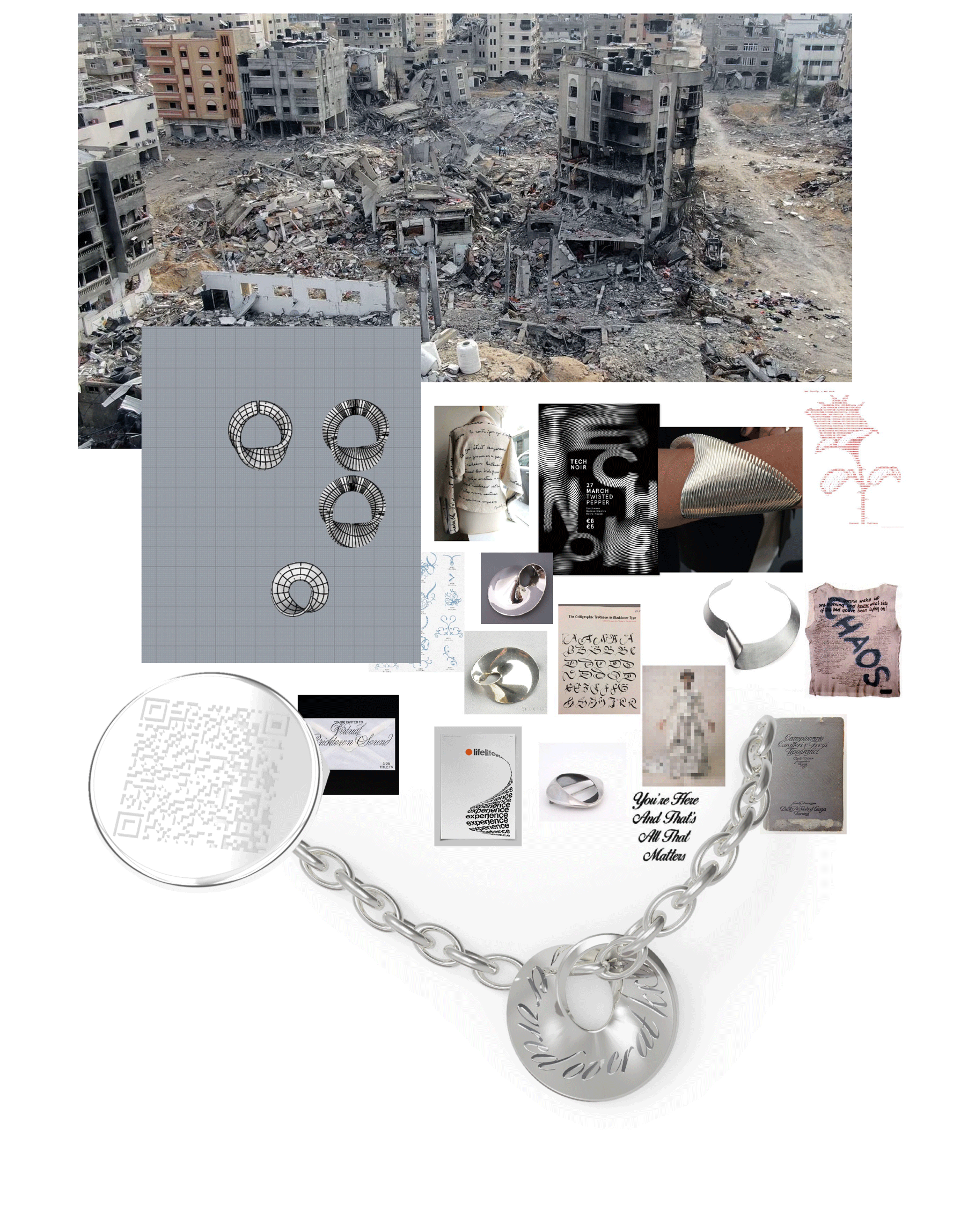 I began my sketching process mainly in Rhino, allowing me to experiment with forms incorporating the Möbius strip principle, where the surface can be followed continuously. Simultaneously, I researched an anti-war text for the jewelry, which was challenging. Eventually, I found inspiration in a long poem, leading to the phrase: “I am angry that war is a constant.”